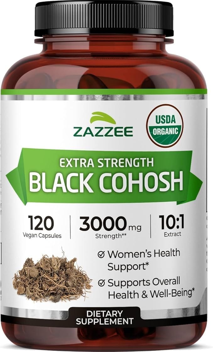 Black Cohosh supplement to support women during menopause by easing hot flashes, balancing hormones, and promoting overall comfort and wellness.